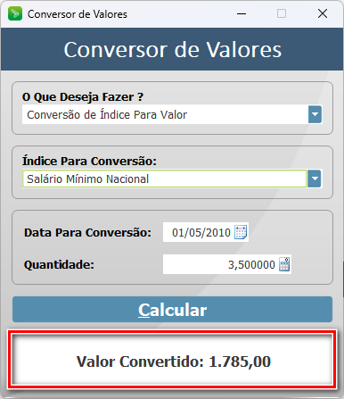 Essa opção informa o valor correspondente a uma quantidade de salários mínimos ou URVs em determinada data.