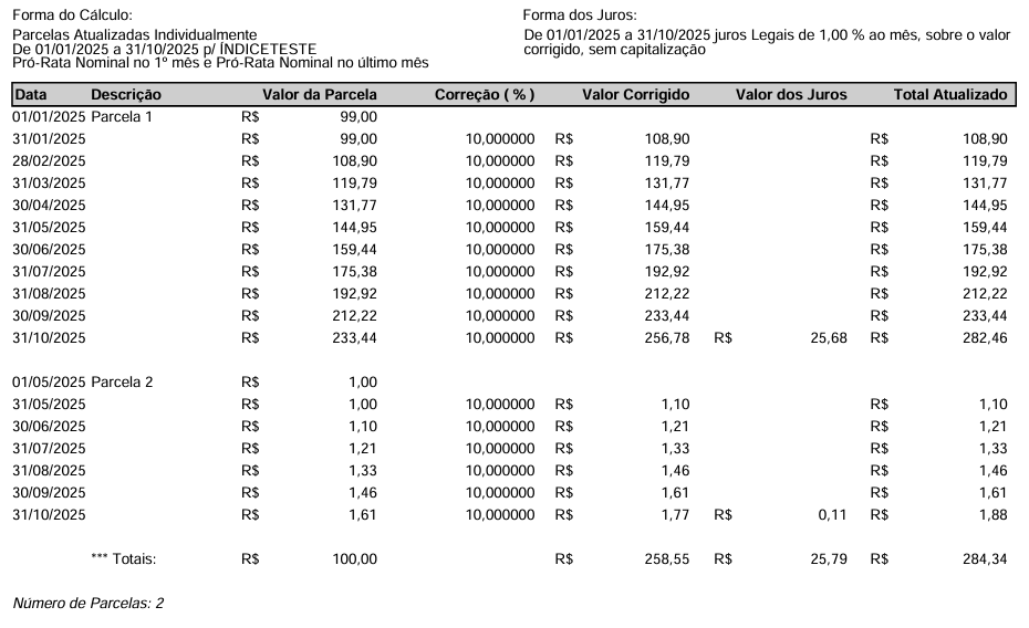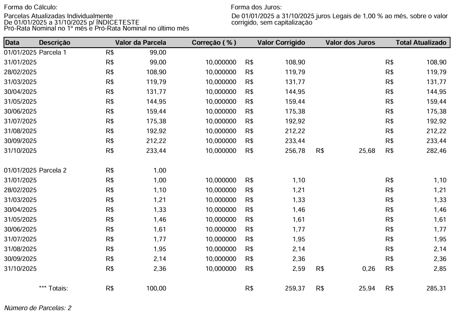 Para ilustrar, analisaremos quatro relatórios processados pelo software Ábacus 6.0, mantendo fixos o valor total de R$ 100,00, correção de 10% ao mês e juros de 1% ao mês.