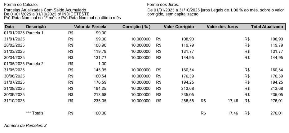 Neste formato, a Parcela 2 (R$ 1,00) só começa a sofrer correção em maio. Os juros de 1% incidem sobre o valor total de cada parcela já corrigido no final do período.